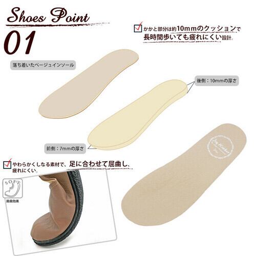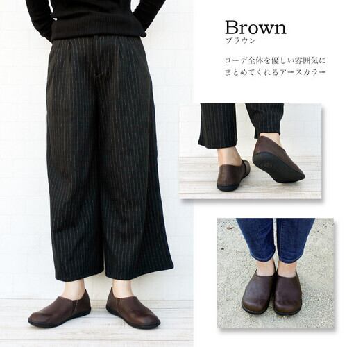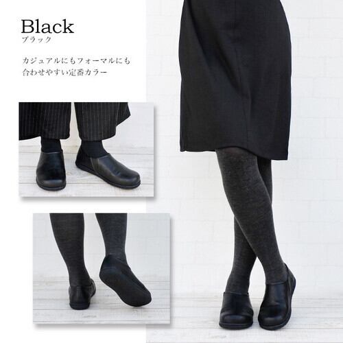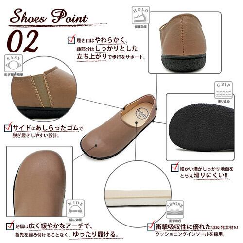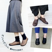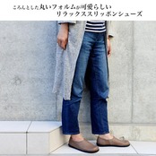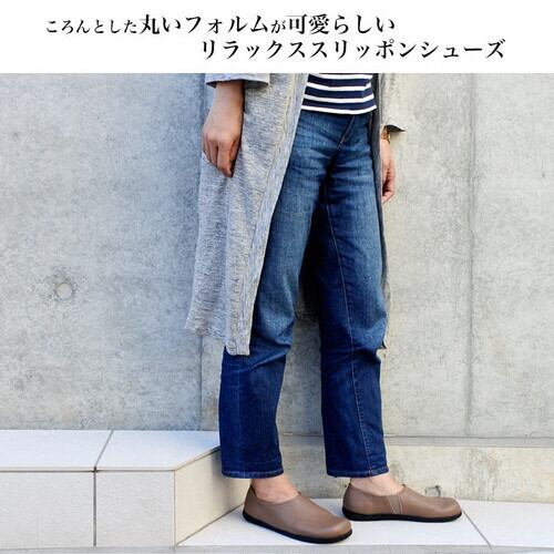 サイドゴムをアクセントにあしらい、脱ぎ履きしやすい作りとなっています。 インソールがふかふかしていて気持ちよく、足全体がやさしく包み込まれている感覚。 つま先部分は広くゆるやかなアーチで、指先を締め付けずゆったりリラックスして履いていただけます。カジュアルにもきちんとした装いにもマッチするデザインとなっております。