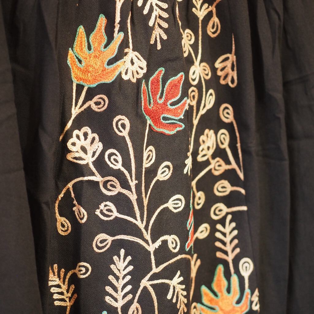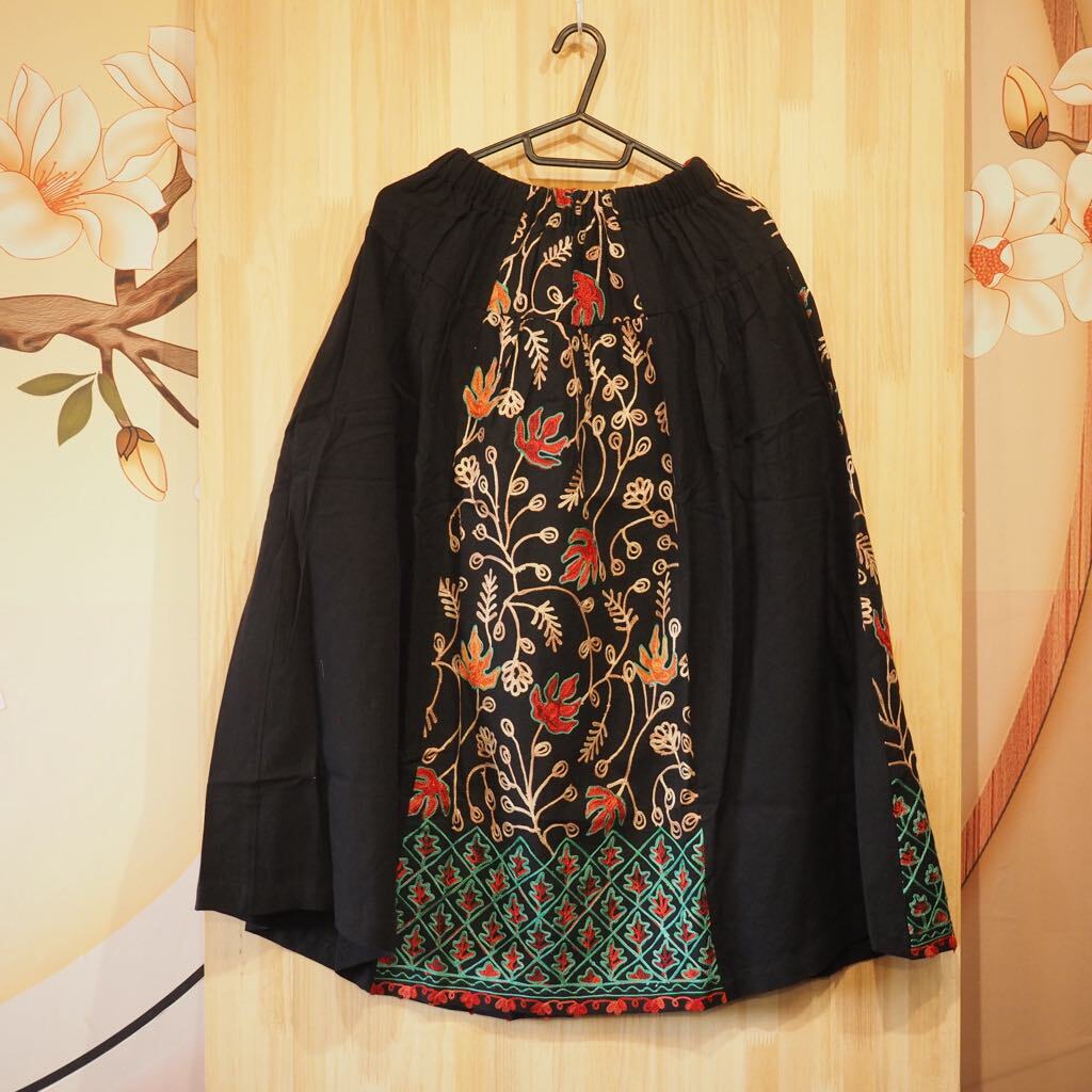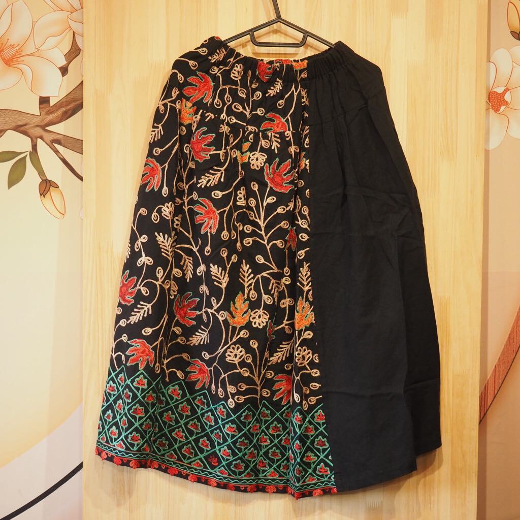 刺繍は糸の風合いにより、プリントでは表現できない仕上がりになることが魅力。刺繍ならではの「立体感」や「高級感」を、ふんだんに楽しんでいただける作品です。裏地付きですので、透け感の心配はありません。両サイドには便利なポケット付き。ウエストはゴム入りですので履き心地も◎※刺繍の出方は、画像と異なる場合がございます。